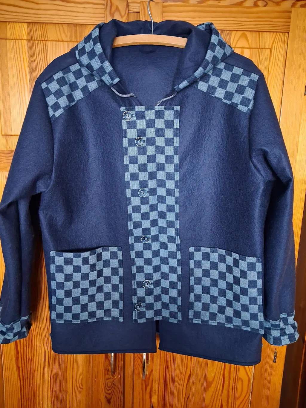Jaciņa - pusmētelītis. Šūšanā izmantots rūtainais džinsa audums un pogas. Malas apšūtas ar tumši zilu kokvilnas audumu. Viss iegādāts "Šarlotes audumos".