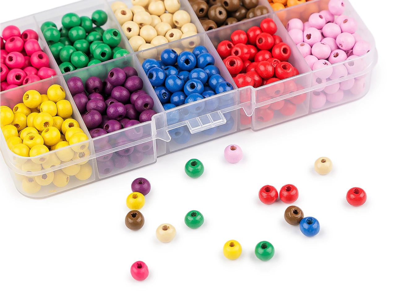 Krāsains un praktisks koka pērlīšu komplekts caurspīdīgā, aizveramā kastītē. Lieliska izvēle gan bērnu radošajiem darbiem, gan aproču, kaklarotu un citu aksesuāru izgatavošanai.