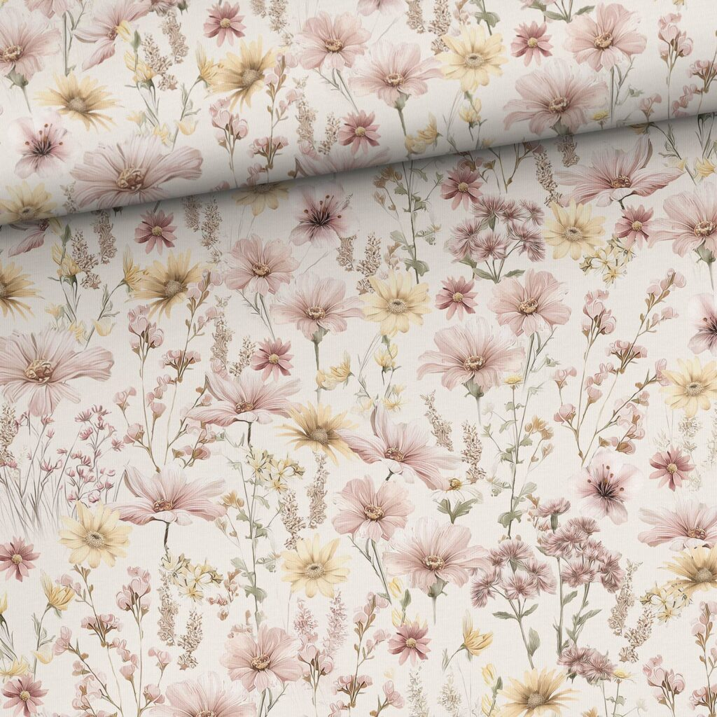 Puuvillane aasaline trikookangas – päikeseline heinamaa 250 g/m²