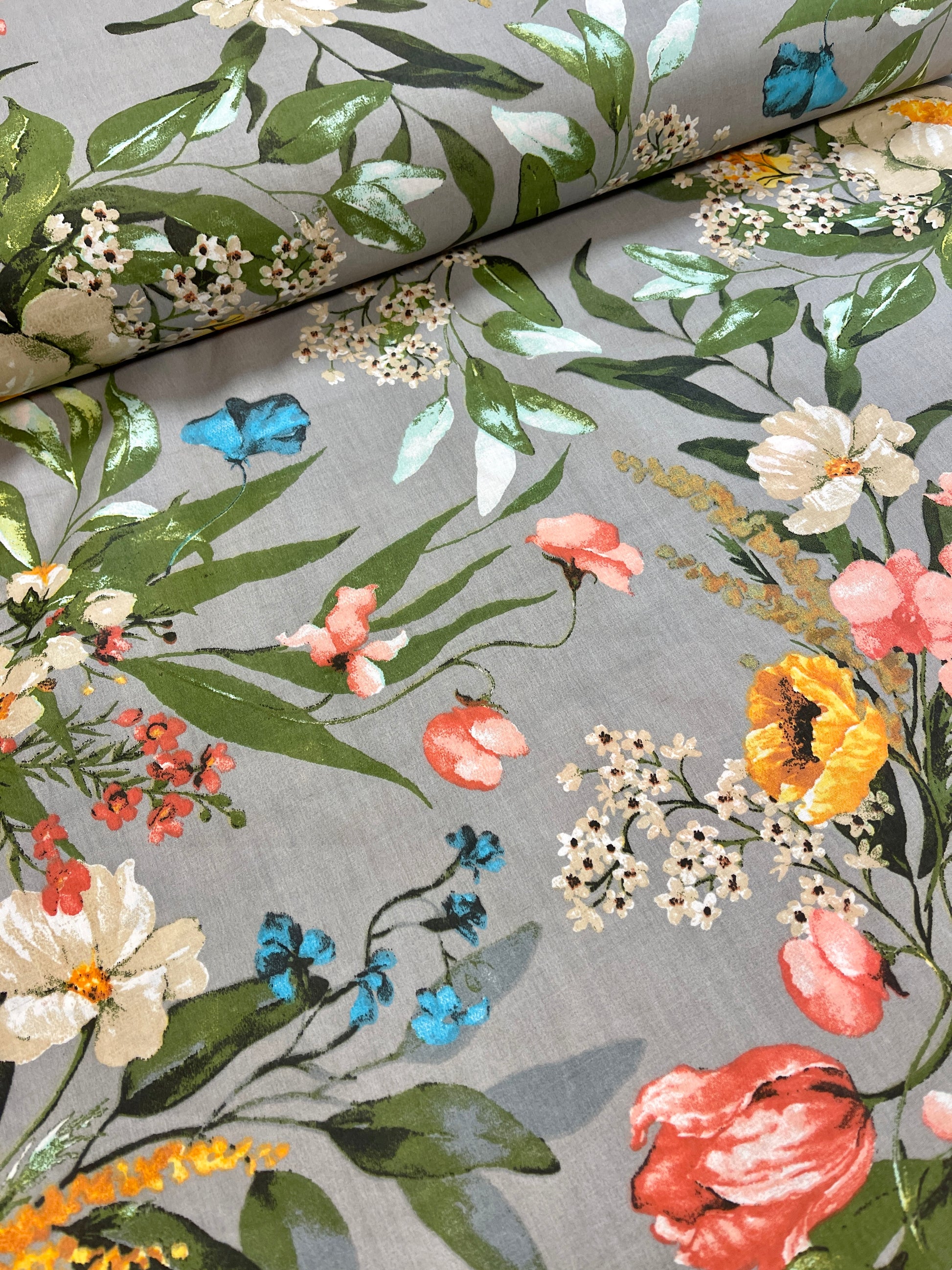 100% medvilnės audinys-gėlės ant pilkos 125 g/m²