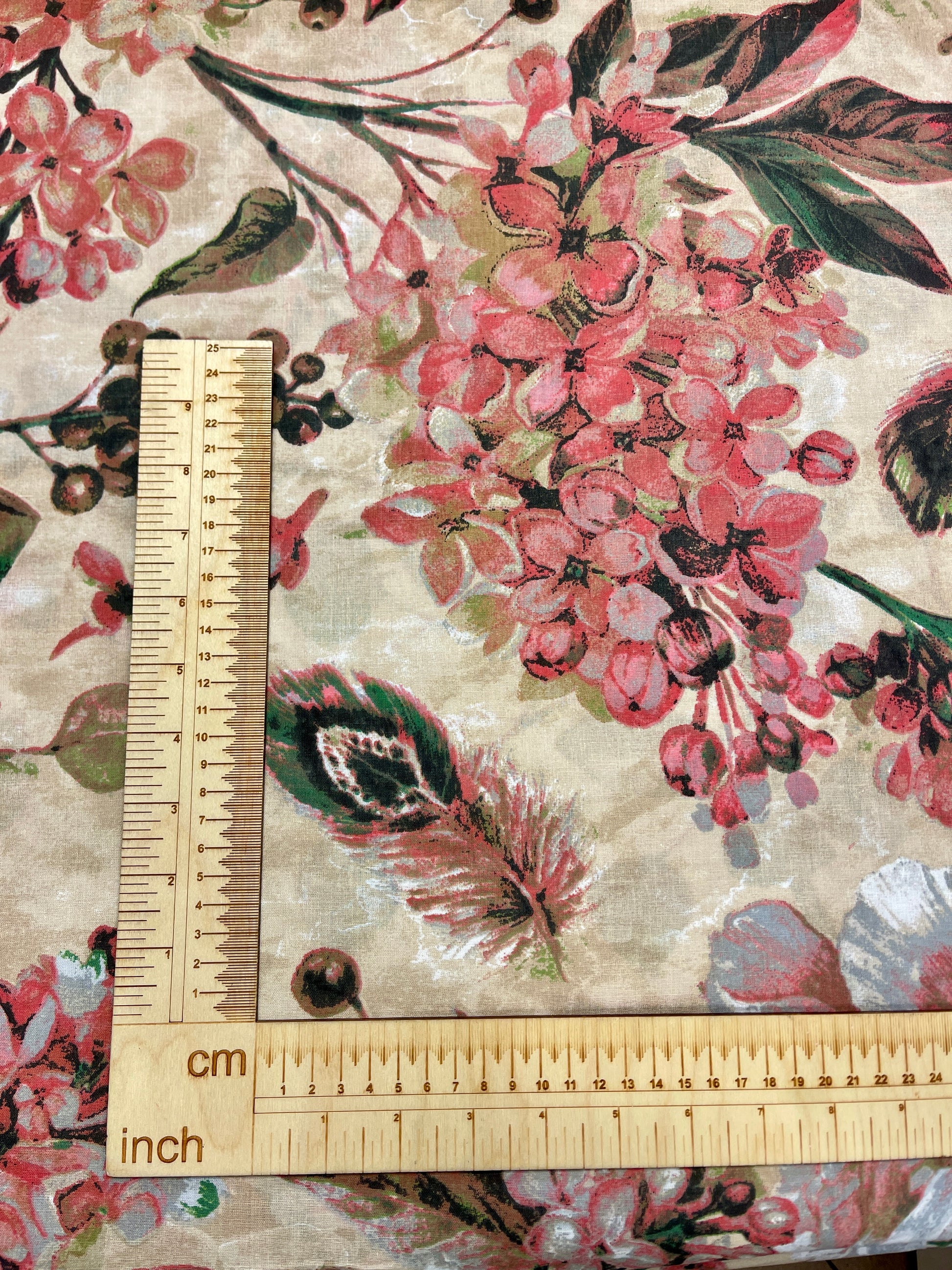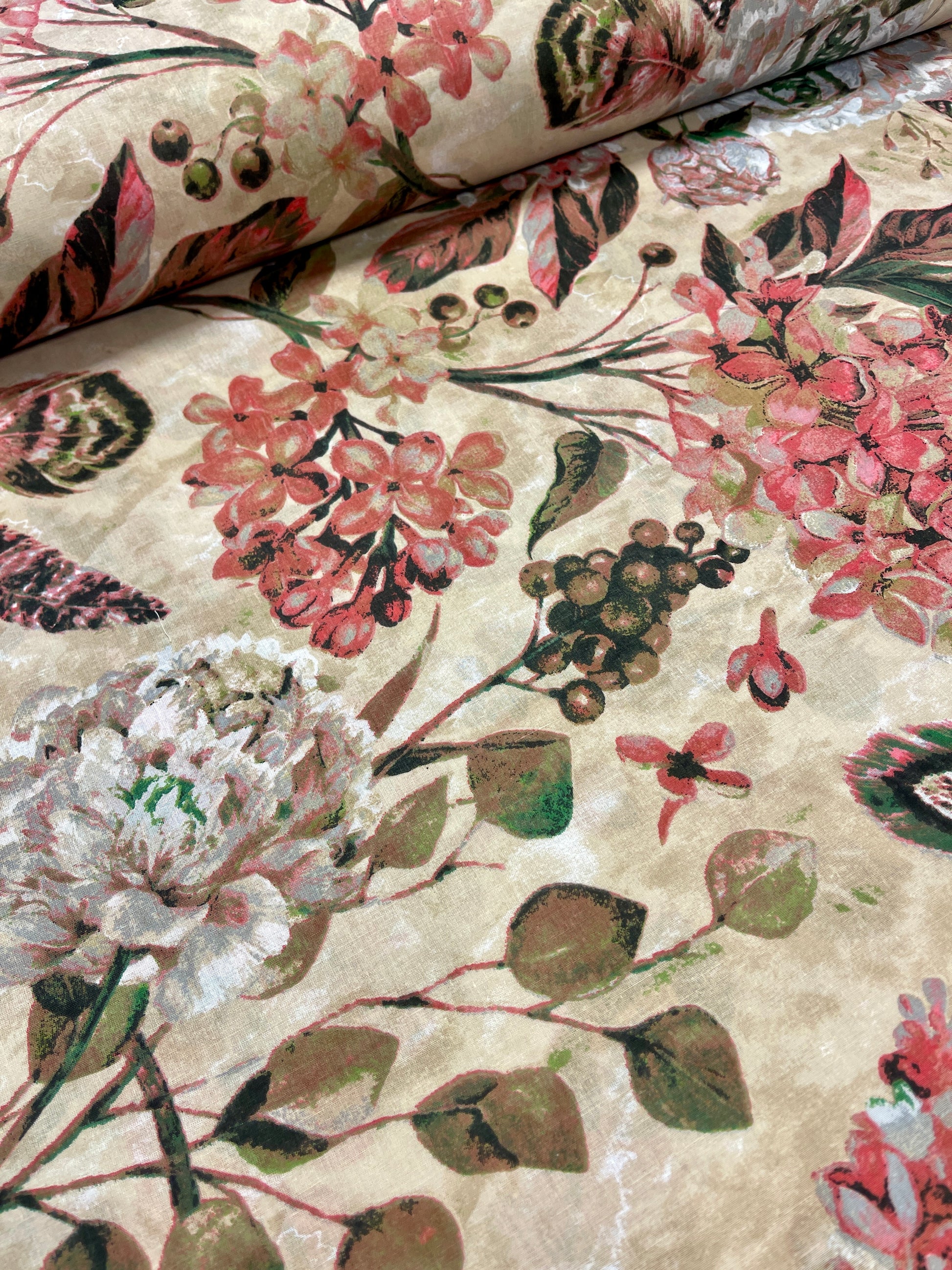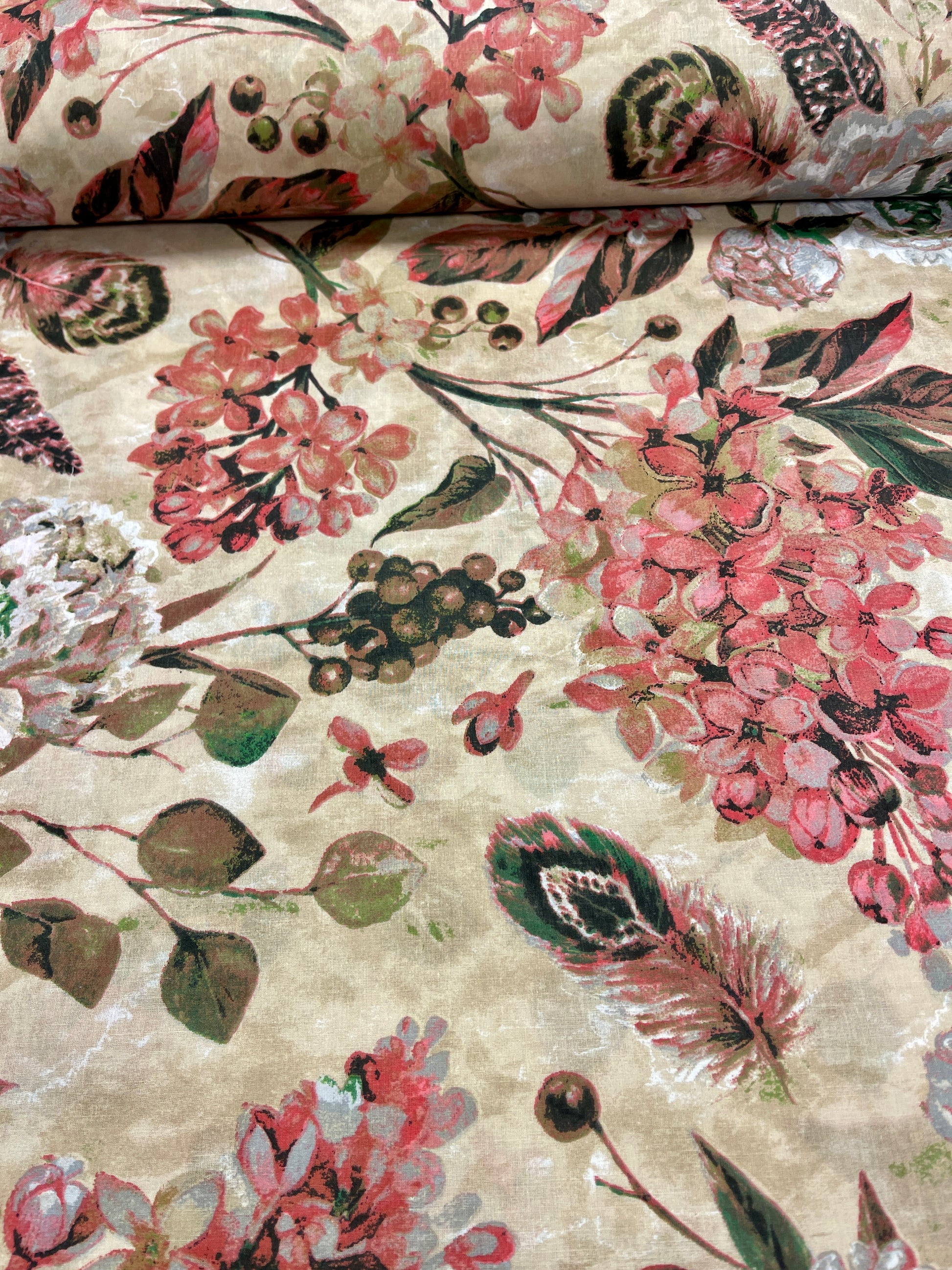 100% Kokvilnas audums-puķu motīvs uz bēša 125 g/m²