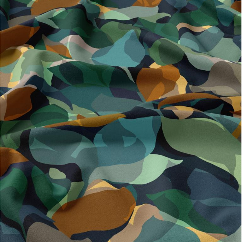 • Mīksts, elpojošs un viegli krītošs 100% viskozes audums ar modernu kamuflāžas stila rakstu tumši zaļos, melnos un silti brūnos toņos. Ideāli piemērots sieviešu un bērnu apģērbiem, kas prasa brīvu kritumu un komfortu pie ādas.