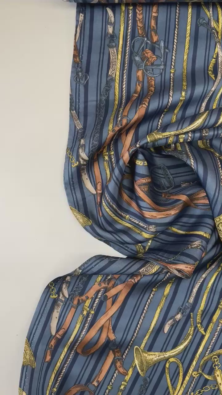 Šis augstākās kvalitātes satīna audums ar krāšņu grafisku apdruku un svītru motīvu apvieno Itālijas tekstilizstrādes meistarību ar greznu dizainu. Ar vieglu blīvumu un zīdainu virsmu tas piešķir katram apģērba gabalam šiku un izsmalcinātību.