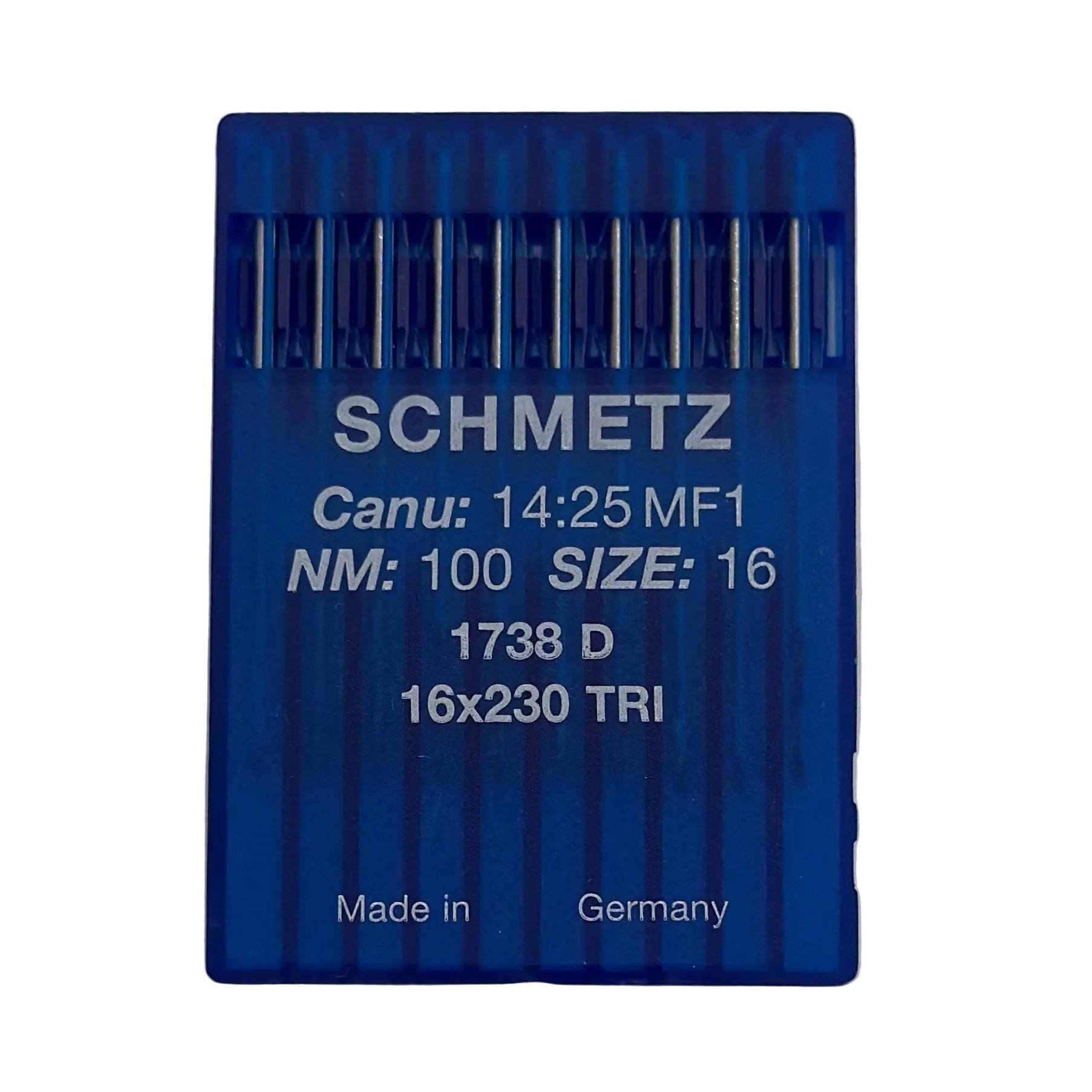 SCHMETZ DBx1 D pazīstamas arī, kā 1738 (A) D ir rūpnieciskās šujmašīnas adatas ādai ar D (Triangular Point) trijstūra griezējgalu. Adatas galam ir trijstūrveida šķērsgriezums, kas nodrošina ļoti spēcīgu griešanas efektu un taisnu, izteiktu dūriena līniju. Ideāli piemērotas cietai, sausai ādai un biezākiem tehniskiem materiāliem. Hroma pārklājums mazina berzi un karstumu, nodrošinot ilgu kalpošanas laiku intensīvā darbā.