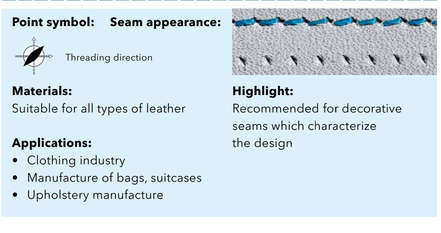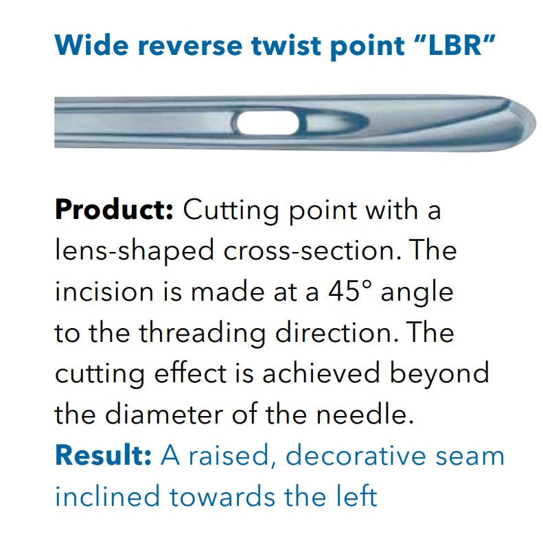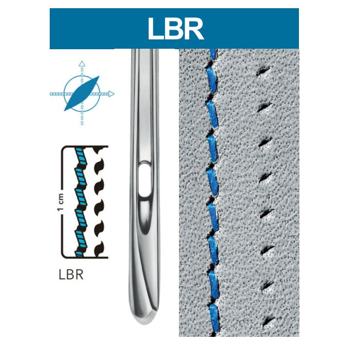 SCHMETZ DPx5 LBR ir rūpnieciskās lockstitch (taisnā dūriena) adatas ādas šūšanai ar LBR (Wide reverse twist point) griezējgalu. Griezums tiek veidots apm. 45° leņķī pret diega virzienu, un “platā” LBR forma dod izteikti dekoratīvu, paceltu šuvi ar slīpumu pa kreisi.