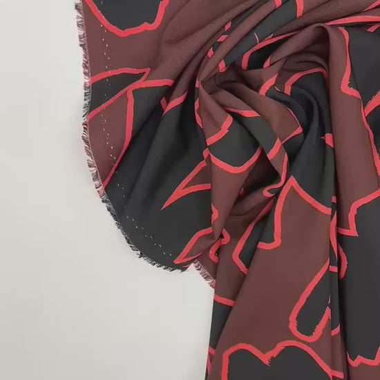 Moderns un elpojošs Itālijā ražots elastīgs poliestera–elastāna audums ar abstraktu rakstu brūnos un melnos toņos ar košiem akcentiem — lieliska izvēle kleitām, blūzēm un radošiem šūšanas projektiem.