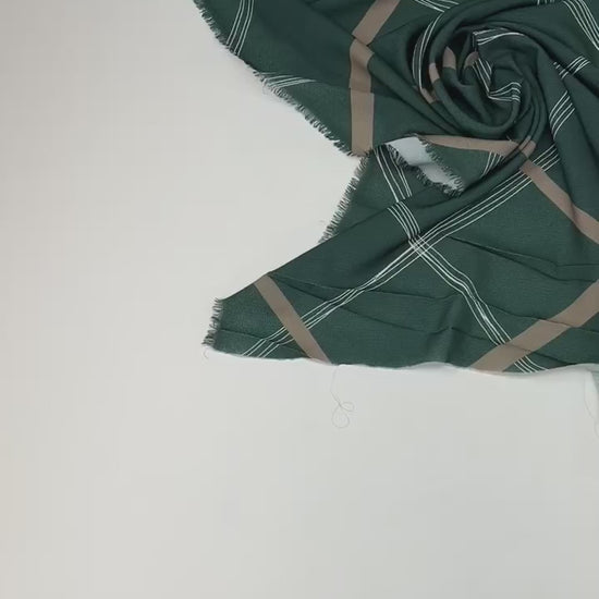 Elegants Itālijā ražots krepa audums ar ģeometrisku rakstu zaļos toņos — viegls, elpojošs un piemērots kleitām, blūzēm, svārkiem un citiem sieviešu apģērbiem.