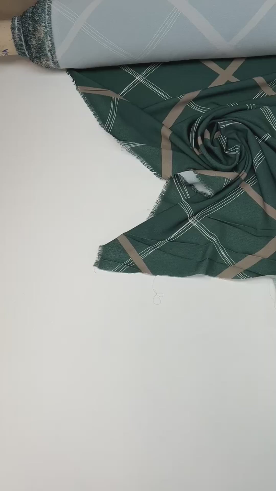 Rakstā apvienots mūsdienīgs ģeometrisks dizains un pieklusināts zaļš tonis, kas padara šo audumu par lielisku izvēli gan ikdienas, gan elegantākiem apģērbiem.