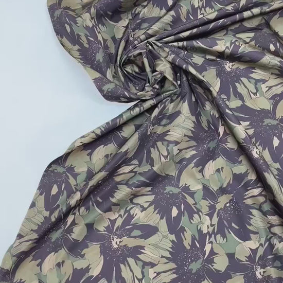 Elegants Itālijā ražots poliamīda audums ar izteiksmīgu ziedu rakstu zaļi brūnos toņos — ideāls vasaras kleitām, blūzēm un citiem gaisīgiem apģērbiem.