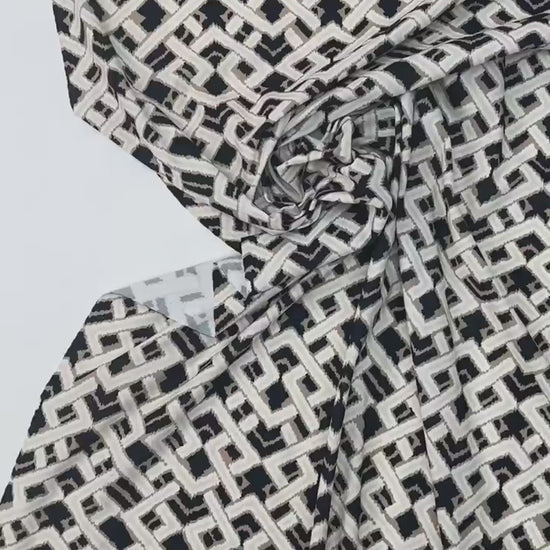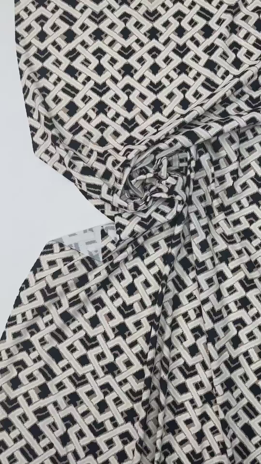 Mūsdienīgs Itālijā ražots trikotāžas audums ar izteiksmīgu ģeometrisku rakstu bēšos un melnos toņos — ideāli piemērots topiem, kleitām, svārkiem, sportiskiem un ikdienas apģērbiem.