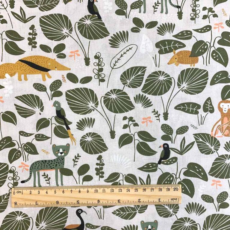 Premium 100% kokvilnas audums-tropu lapas ar dzīvniekiem 115 g/m²