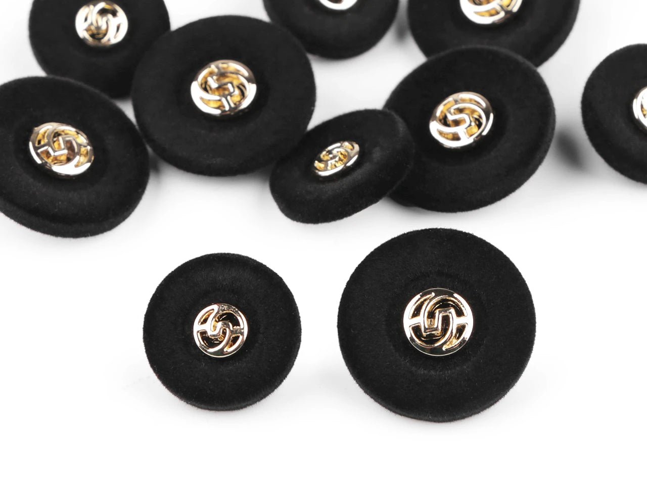 Elegantās pogas ir pārklātas ar samtu un vidū ir metāla rotājums. Tie izceļas uz jakām, džemperiem, vestēm utt. Tiem ir šuves apakšā.